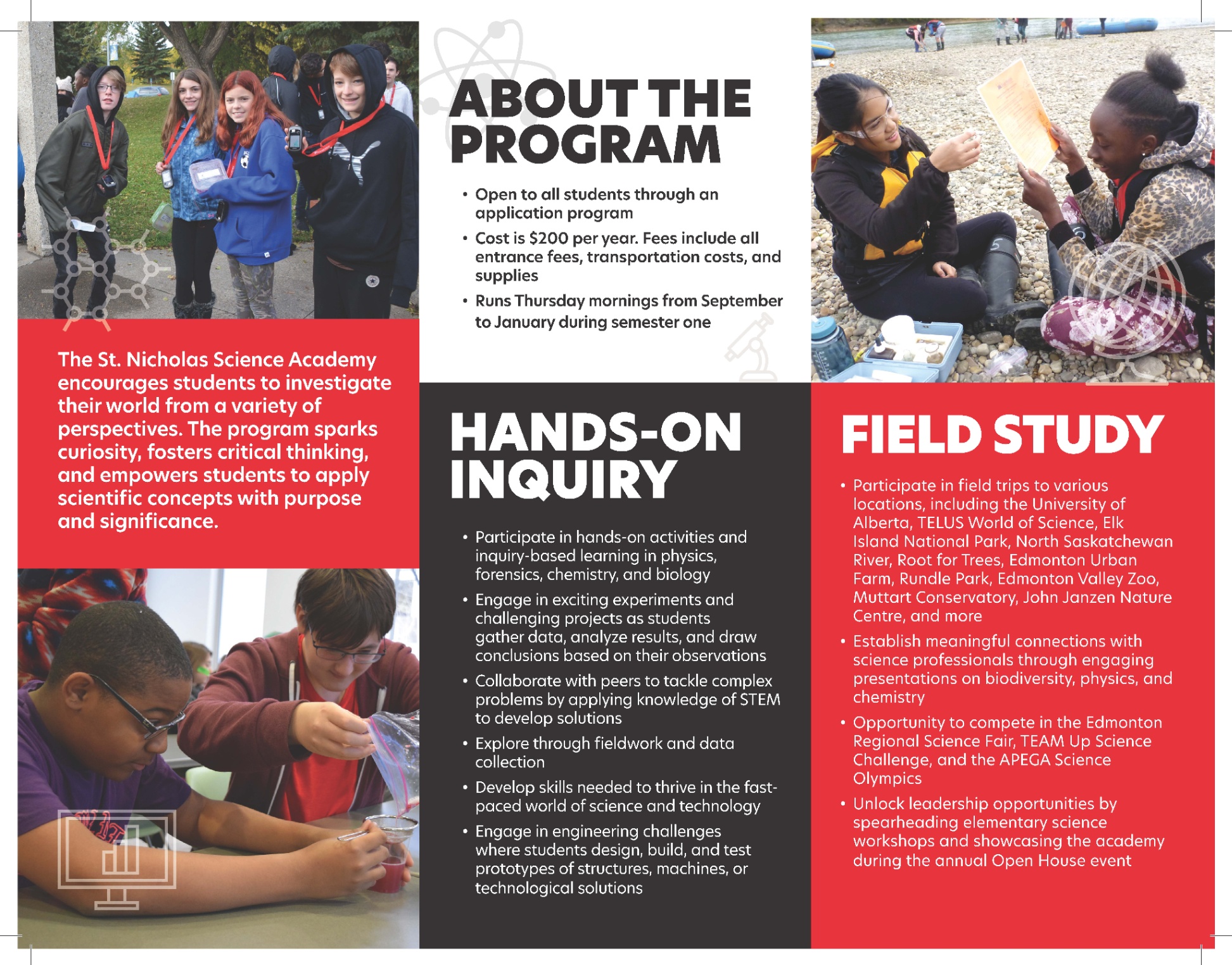 Through field trips and hands-on activities, the St. Nicholas Science Academy encourages students to investigate their world from a variety of perspectives. This program is open to all grade 8 and grade 9 students through an application process. The Science Academy runs in the CTF Thursday morning schedule in one semester only.