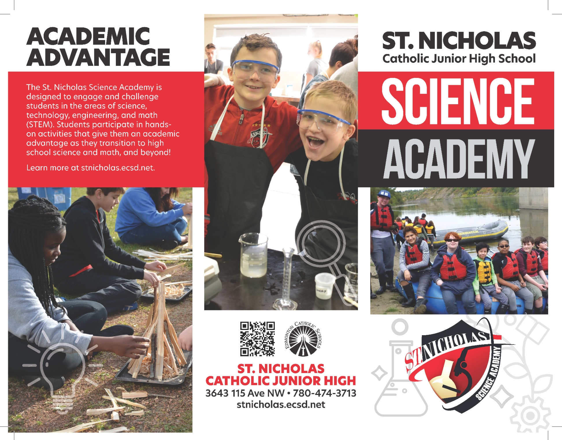 Edmonton Catholic School Division’s Science Academies offer students enhanced learning opportunities in the various fields associated with Science. Through various STEM (Science, Technology, Engineering and Math) learning activities, Science Fairs and Science Olympics, students are encouraged to participate in hands-on Science. By employing a variety of educational experiences in Science related areas, students learn to apply Science to their personal lives, appreciate the role Science plays in every aspect of their lives and to consider various careers in areas associated with Science. Partnerships with organizations such as APEGA (Association of Professional Engineers and Geoscientists of Alberta) allow the Science Academies to develop programming that goes beyond the classroom experience of Science and take the students into the world around them to experience what they have learned.